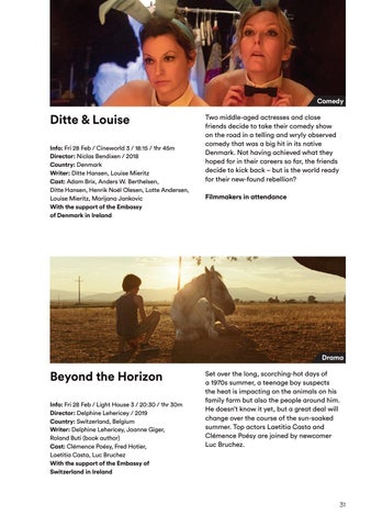 Beyond the Horizon Info: Fri 28 Feb / Light House 3 / 20:30 / 1hr 30m Director: Delphine Lehericey / 2019 Country: Switzerland, Belgium Writer: Delphine Lehericey, Joanne Giger, Roland Buti (book author) Cast: Clémence Poésy, Fred Hotier, Laetitia Casta, Luc Bruchez With the support of the Embassy of Switzerland in Ireland