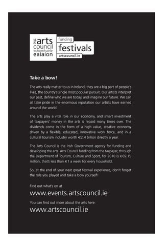 Take a bow! The arts really matter to us in Ireland; they are a big part of people’s lives, the country’s single most popular pursuit. Our artists interpret our past, define who we are today, and imagine our future. We can all take pride in the enormous reputation our artists have earned around the world. The arts play a vital role in our economy, and smart investment of taxpayers’ money in the arts is repaid many times over. The dividends come in the form of a high value, creative economy driven by a flexible, educated, innovative work force, and in a cultural tourism industry worth a2.4 billion directly a year. The Arts Council is the Irish Government agency for funding and developing the arts. Arts Council funding from the taxpayer, through the Department of Tourism, Culture and Sport, for 2010 is a69.15 million, that’s less than a1 a week for every household.