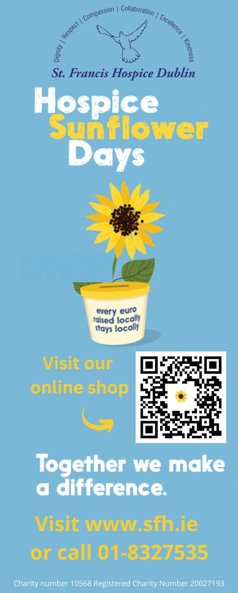 You can also help by supporting the annual Sunflower Days campaign on Friday 9th and Saturday 10th June. collectors will be out in the shops and on the streets, you can visit our online shop on www. sfh.ie, or contact the Fundraising team on (01) 832 7535.