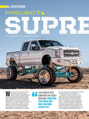 that hasn’t been done. Something that would just have a big wow factor to it,” he details. Nicknamed “Project Supremacy” for its original intentions to reign supreme above all other customs, Suarez hooked up with PMF Suspension to make sure the lift was beyond perfect. “The design was mostly in the lift kit,” he says. “We spent many hours designing it to make sure it would be different.” After the lift was perfectly designed and ready to go, Suarez turned his attention to the build’s wheels and partnered with Specialty Forged Wheels to create a one-off design to complement his project.