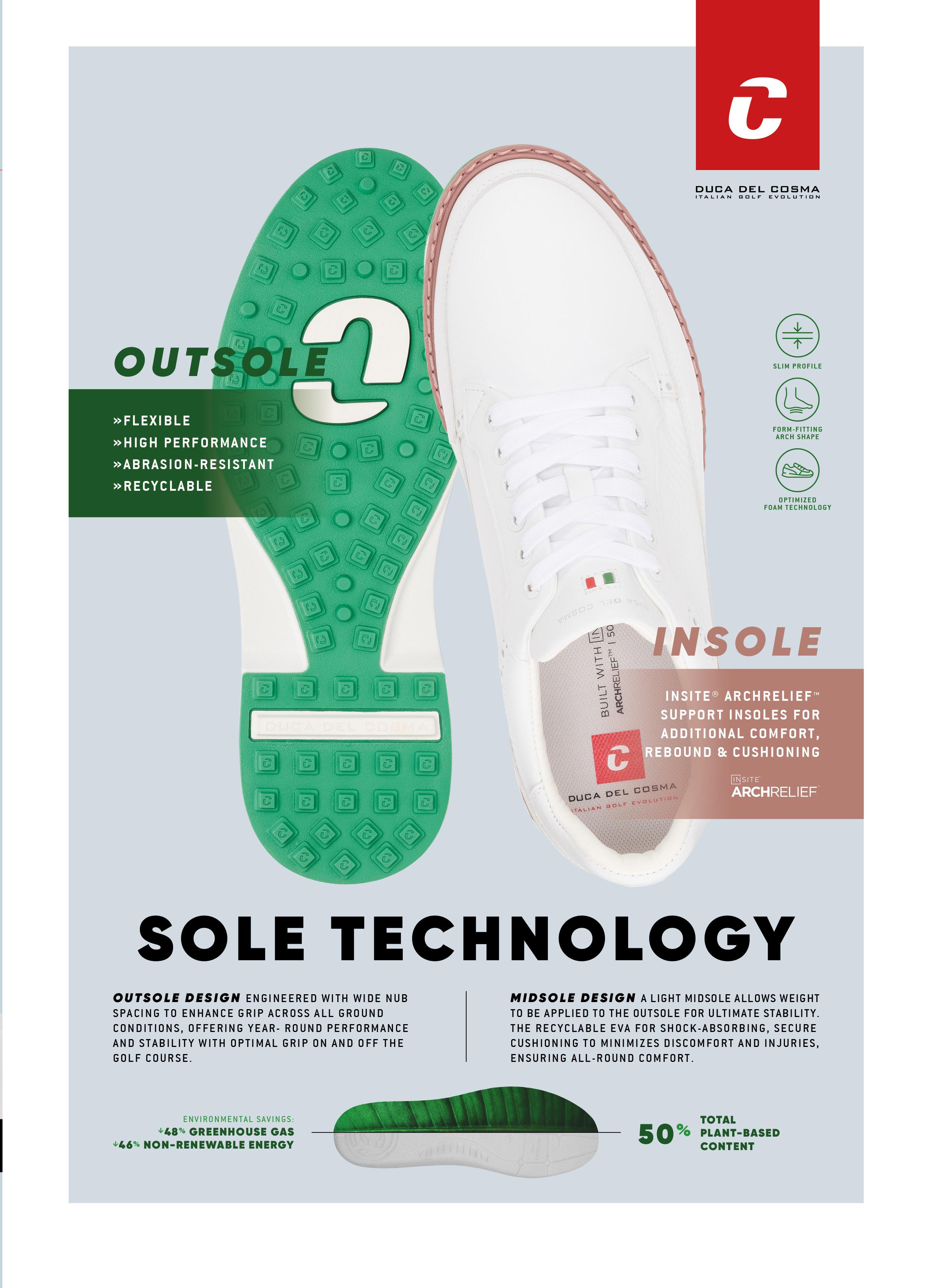 At Duca del Cosma, innovation starts from the ground up - literally. Our diverse range of advanced Airplay outsoles forms a core part of our performance-driven design philosophy. Whether you prefer the ultra-lightweight comfort and enhanced stability of our spikeless models, or the superior grip and stance offered by our spiked versions, each outsole is engineered for excellence on the course. With such a wide selection, Duca del Cosma offers the ideal outsole for every playing style - so you can choose the perfect golf shoe to elevate your game.