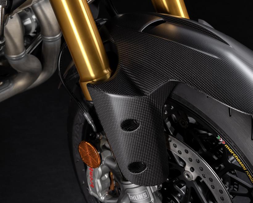 Componenti in fibra di carbonio e rifiniture di qualità superiore: sulla Multistrada V4 Pikes Peak, ogni dettaglio unisce eleganza e performance.