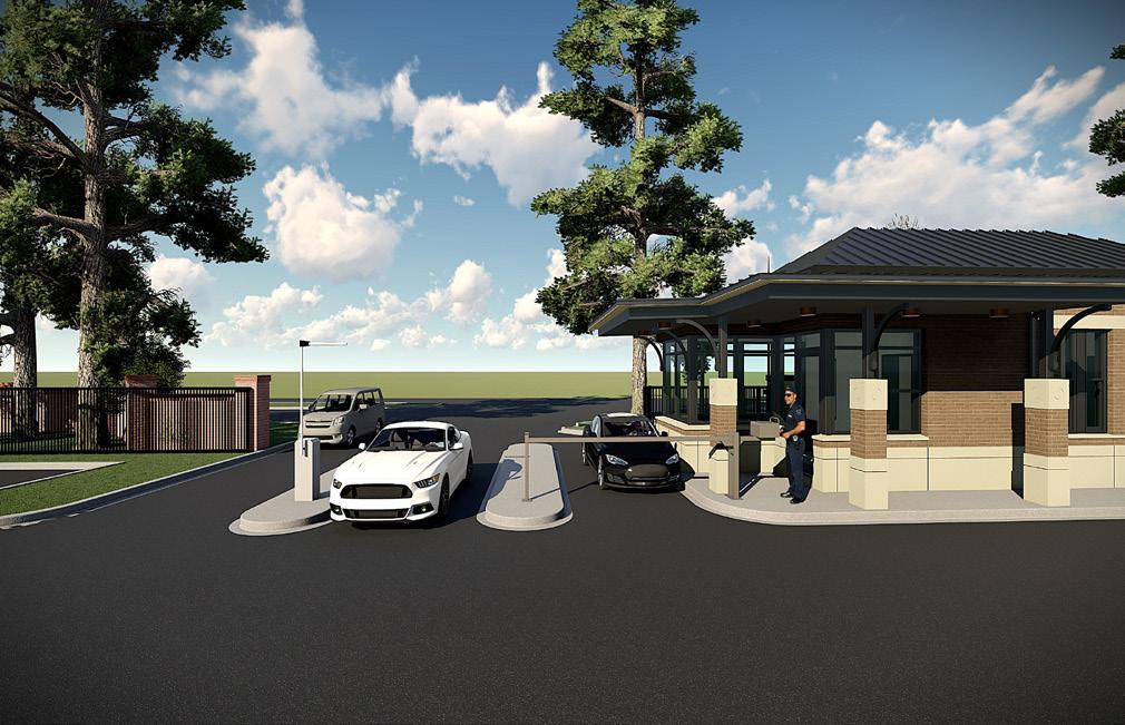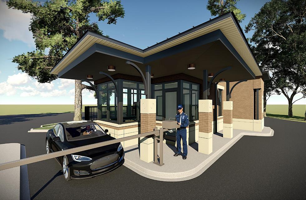 A shift in the position of the guardhouse opens up three lanes of traffic, two for approved members of the community and one for guests, each with gate barrier arms. This configuration provides continuous coverage of the entrance with the presence of two security personnel, at least one of whom will be armed.
