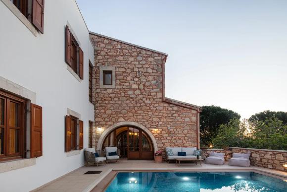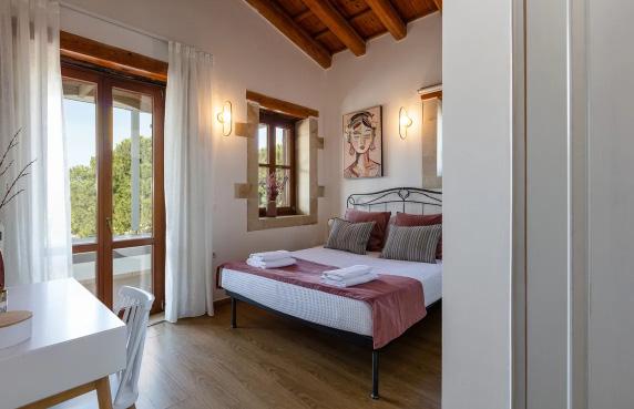 Villa Mesogea features 4 beautiful suites with ensuite bathrooms and private outdoor seating areas. Three of the suites sleep 2 and the fourth suite is 2 levels and sleeps 4, with 2 on the lower level in twin beds and 2 in the upper loft in a full bed. The villa also has a private pool for you and your guests. Date to be mutually agreed upon. Valid through April 30, 2026.