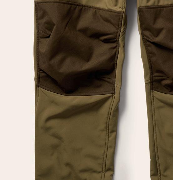 Bonded softshell fleece in the leg fabric for warmth. Knees and seat feature water repellant overlays. Crouch and sit without worry.