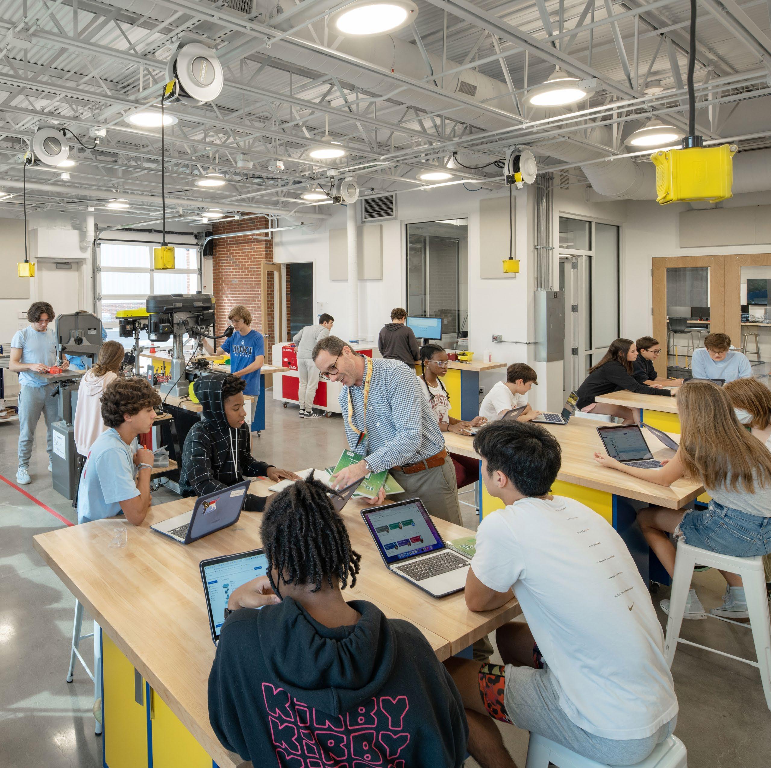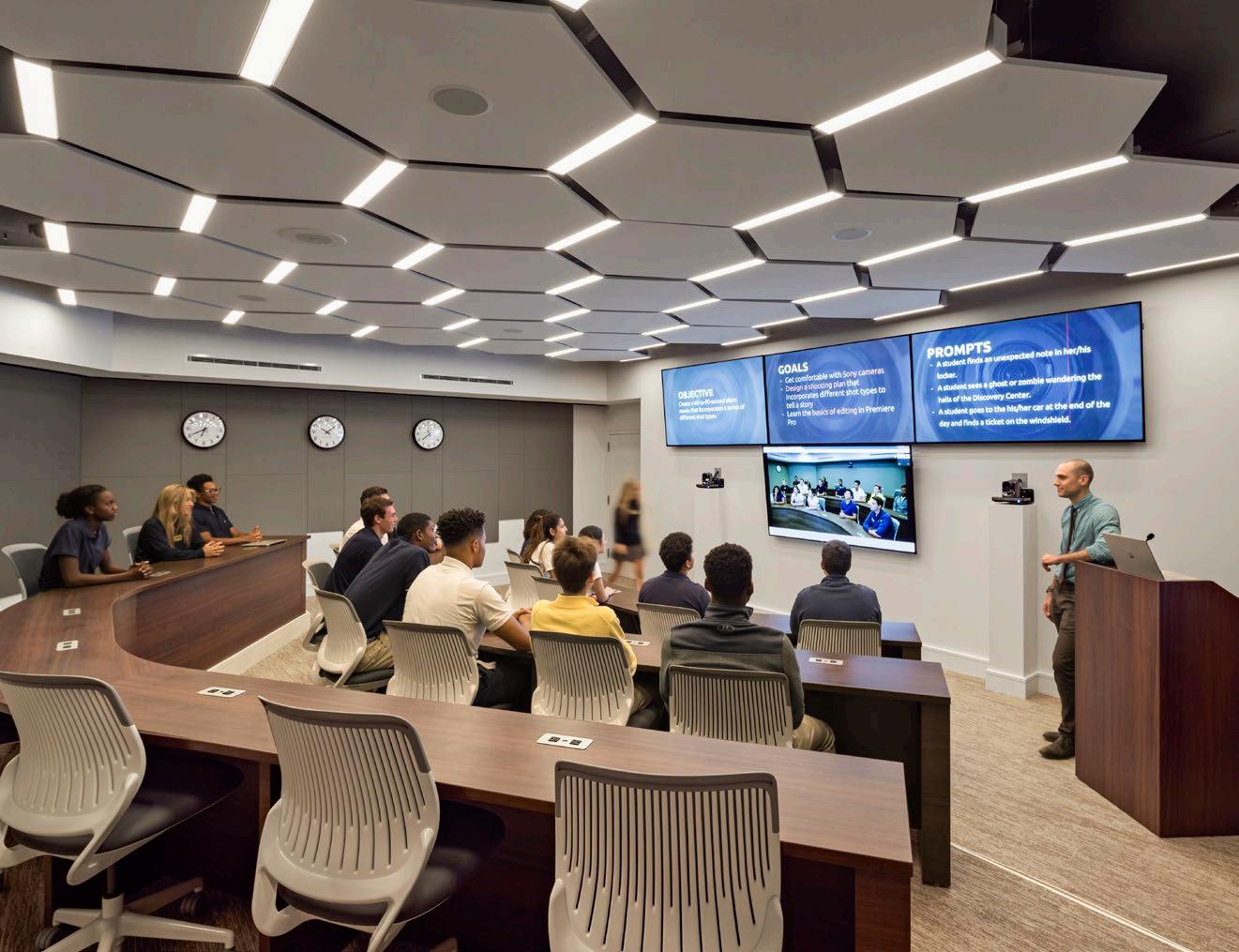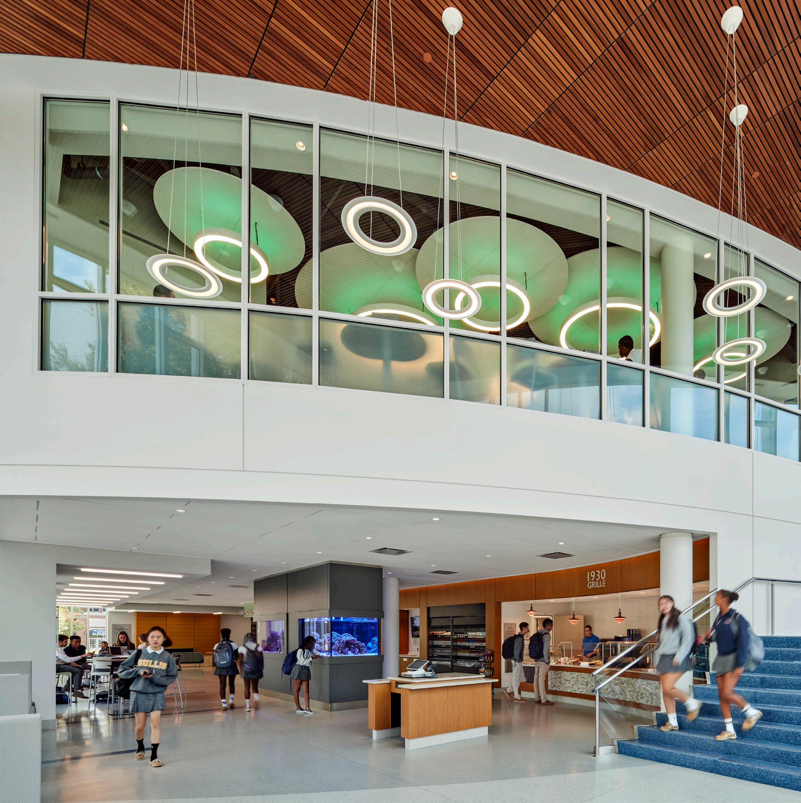 The Discovery Center is the new heart of the Bullis School—a K-12 environment that aspires to be at the forefront of preparing students to become future leaders. Learning, creativity and exploration are enhanced and enriched with open and flexible spaces that promote collaboration and invention. A specialized classroom advances a growing entrepreneurial program, while other classrooms and lab spaces strengthen programs in robotics, fabrication, and distance learning. Traditional learning labs for chemistry, biology, and physics are supplemented by more flexible study spaces and meeting rooms. A feature wall outside the Studio Theater puts science on display, while numerous spaces are configured to allow students, and the entire Bullis community, opportunities for socializing and casual interaction—activities that are proven to foster inspiration and innovation.