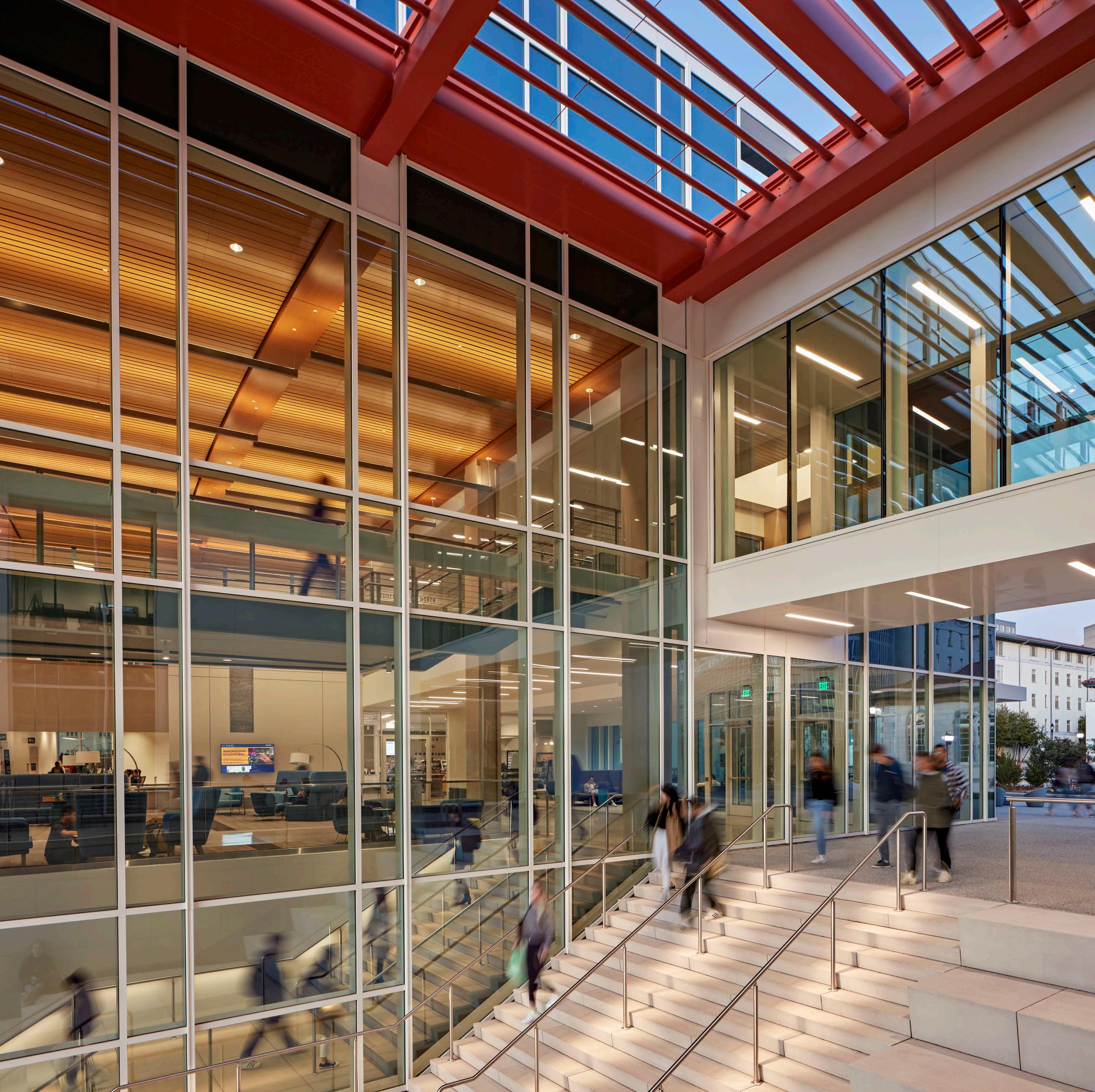 Student life spaces must support increasingly collaborative, interactive, and technology-rich learning and teaching experiences. Flexible configurations allow education environments to be engaging and active, with the ability to scale up for lectures, whether in person or virtually, and break down into small groups to facilitate hands-on and team-based learning. Academic building design is about more than classrooms—it is about placemaking. It must facilitate efficient flow while providing informal spaces where students and faculty can socialize, collaborate, study, and work in a more relaxed setting. The spaces around and leading to education spaces, both within the building and outside, are equally important in defining and enabling learning. An academic building and its common spaces define the experience of students and faculty.