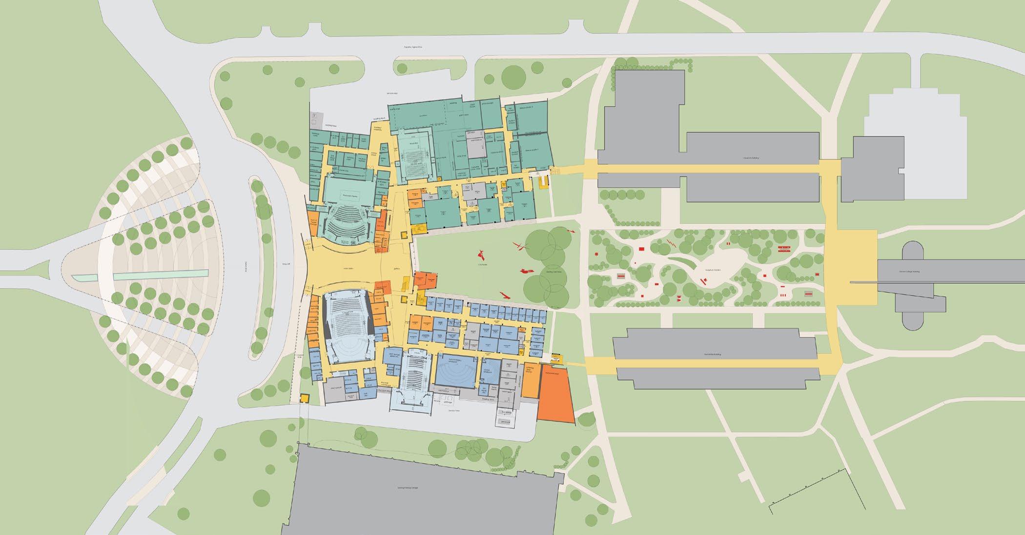 The design envisions future phases to expand the facility to accommodate larger scaled performances and add more instructional and rehearsal space.