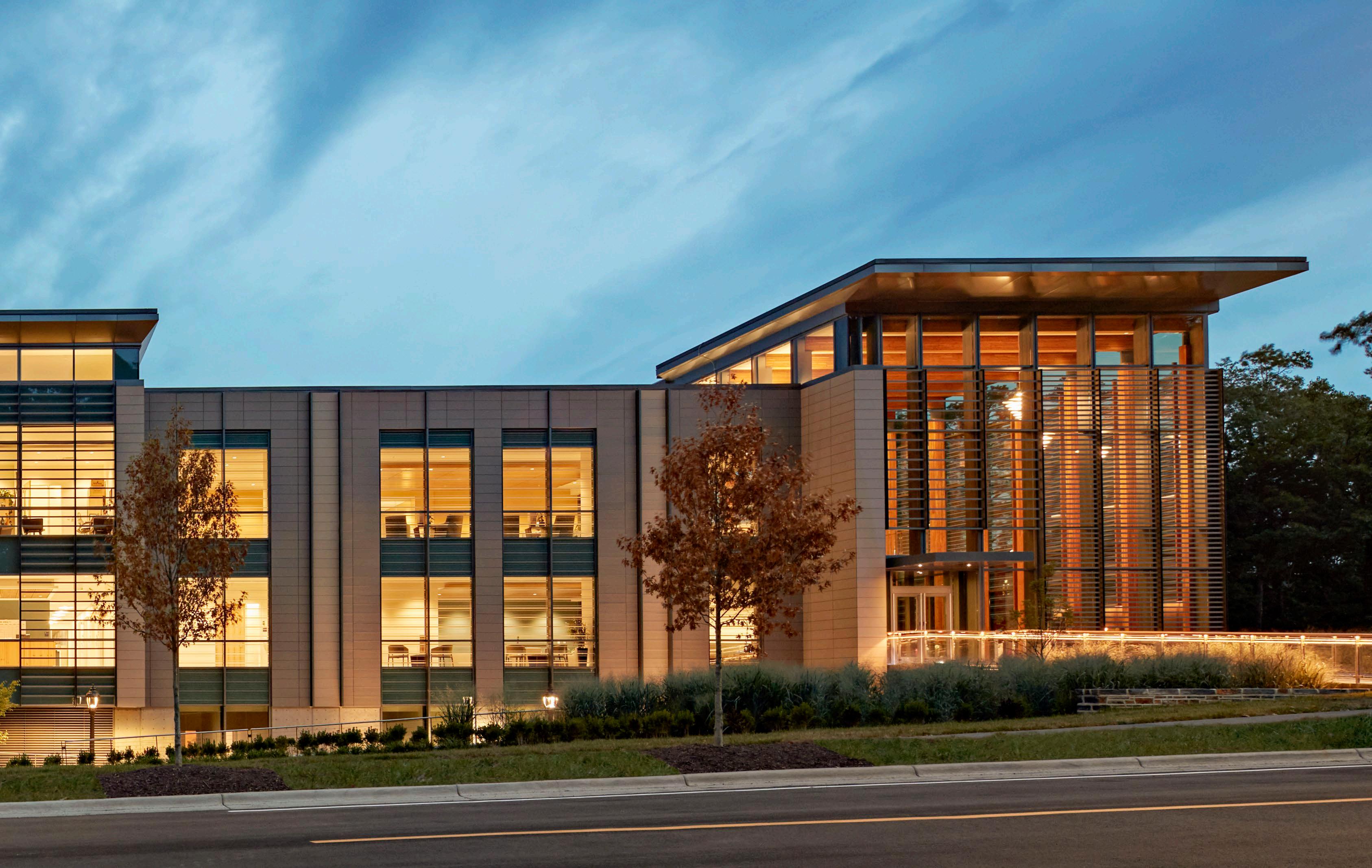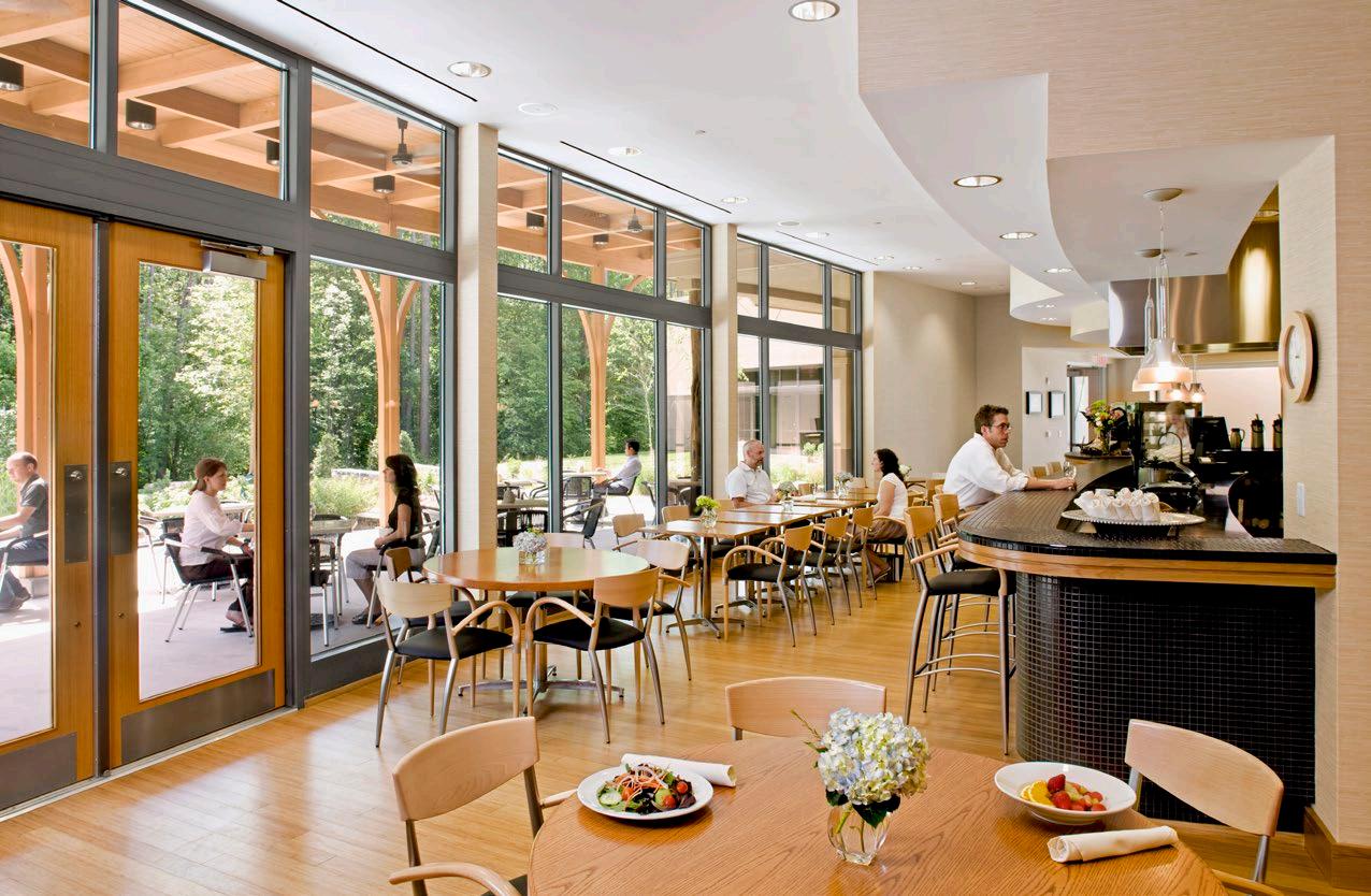 Duke Integrative Medicine unites traditional and alternative medicine in a holistic environment for mind, body and spirit. Nestled in the woodlands of Duke Forest, the welcoming and comforting environment interweaves natural features with the man-made requirements of modern clinical care. Essential to Integrative Medicine’s mission to provide a comprehensive, customized, whole-person approach to health care is the building’s connection to the outdoors and to healing gardens and paths. Building programs include treatment rooms, workshop and meditation spaces, a circular library with a soaring wood framed cathedral ceiling, and a state-ofthe-art café. Bamboo grows to reach clerestory windows in the sun-drenched meditation room.