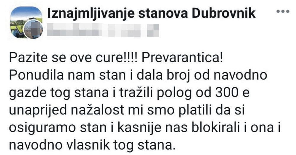 A pored svega toga, još jedan od izazova, u zadnje vrijeme učestaliji nego inače, su prevare. Vidljivo je to na Facebook stranici Iznajmljivanje stanova Dubrovnik.