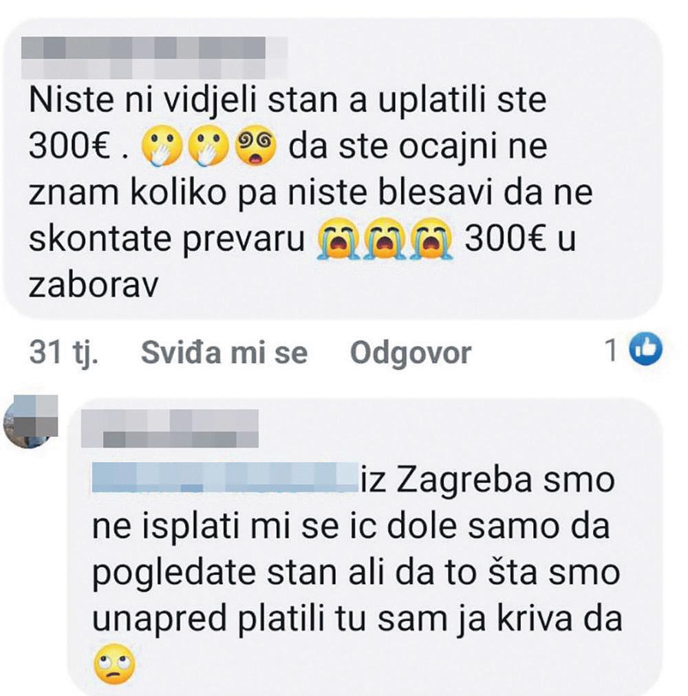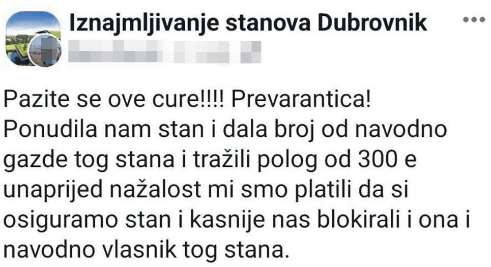 Tako u drugoj objavi s početka godine sugrađanka piše: „Pazite se ove cure! Prevarantica! Ponudila nam stan, dala broj od navodnog gazde tog stana, tražili su polog od 300 eura unaprijed. Nažalost, mi smo platili da si osiguramo stan i kasnije su nas blokirali i ona i navodni vlasnik tog stana.“
