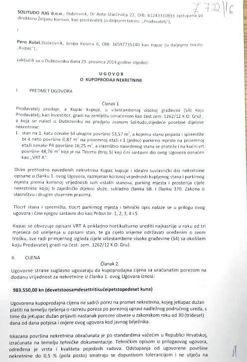 2400 eura po kvadratu, a prosječna cijena u Dubrovniku 3000 eura Dubrovački dnevnik u posjedu je kupoprodajnih ugovora članova Uprave Juga. Oni su stanove otkupljivali od firme Solitudo Jug d.o.o., drugim riječima, sklapali su kupoprodajne ugovore sami sa sobom. Pero Kulaš potpisuje krajem 2014. godine kupoprodajni ugovor s direktorom Solituda Jug Željanom Konsuom (obojica istovremeno dopredsjednici Juga) i postaje vlasnik stana od 54 kvadrata, vrta od 50 kvadrata, te parkirnog mjesta. U kupoprodajnom ugovoru navedena je cijena od 983 tisuće kuna, to je otprilike 2400 eura po kvadratu. Supruga Pera Kulaša, Dubravka Merčep Kulaš, krajem 2014. godine potpisuje sa Željanom Konsuom istovjetan kupoprodajni ugovor. I ona postaje vlasnica stana od 54 kvadrata s vrtom od 50 kvadrata te parkirnim mjestom za 983 tisuće kuna odnosno oko 2400 eura po kvadratu. Riječ je, ponavlja-