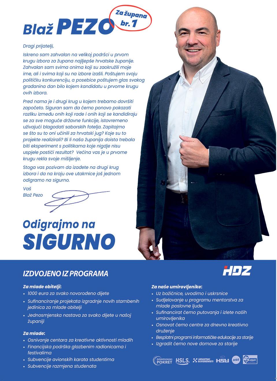 Zato vrijeme Božo Petrov obećava slušati potrebe građana i rješavati probleme koji ih muče diljem županije. U finišu kampanje, izjavama sve više podsjeća na kampanju kojom je Most uspio postati dio državne politike, nakon Metkovića. Tada je to bila nada u promjene, u neke drugačije i iskrene nove političare. Na kraju su nažalost postali dio politike kakva je uobičajena na našim prostorima. Pogodovanje kumovima i ‘svojima’ uz stalno prozivanje drugih za baš takvo djelovanje. Teško je nakon svega doista vjerovati vjerodostojnosti Petrova, ali taj problem imaju i ostali političari. Nije to samo Mostov krimen. S druge strane Pezo isto ponavlja sve ono što želimo čuti, jedino što se nije previše potrudio poraditi na komunikacijskim sposob-