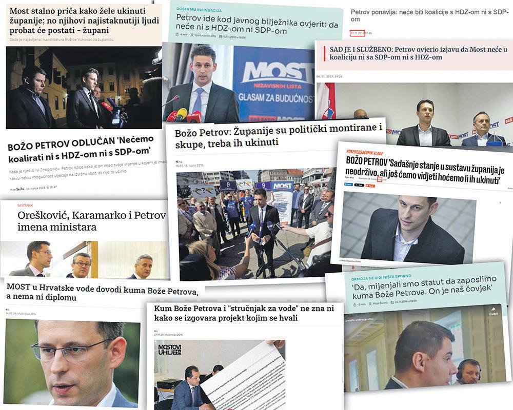 ka, odlučili su se za koaliciju s HDZ-om. Za premijera su postavili Tihomira Oreškovića, čovjeka koji nije ni znao hrvatski jezik, za kojega nikad nitko u izborima nije ni čuo, kao ni oni sami prije toga, a resore koje su dobili u političkoj trgovini popunjavali su sa svojim kadrovima, pa su tako pravosuđe krenuli reformirati sa sudcem Općinskog suda u Metkoviću, a unutarnje poslove s instruktorom u teretani u Pločama. Jedan od poznatijih poteza iz Vlade Mosta iz tog vremena je pokušaj ukidanja Policijske uprave u Dubrovačko – neretvanskoj županiji koja je trebala potpasti pod upravljanje s centralom u Splitu. Naravno, cijela ta priča oko Mostove koalicije ne može se odvojiti od jednog od PR-ovski najpoznatijih poteza u hrvatskoj politici. Božo Petrov u jeku kampanje potpisao je u javnog bilježnika izjavu kako neće koalirati ni s HDZ-om ni s SDP-om. Gotovo ne postoji medij u Hrvatskoj koji o ovome nije izvijestio. Bilo je to i službeno obećanje ‘’trećeg puta’’ kako su upravo oni jamac promjena u Hrvatskoj. No, to je bila laž. Nakon toga su ipak koalirali s HDZ-om. Dvaput. U svakom slučaju, zanimljiv je i intrigantan i životni i politički put Boža Petrova koji je htio biti fratar, pa postao psihijatar, potom gradonačelnik Metkovića, bio je i dio vlasti, predsjednik Sabora, saborski je zastupnik, a sada želi biti župan jedne od lokalnih samouprava koju je želio ukidati i čije je institucije iz Dubrovnika pokušavao prebaciti u Split.