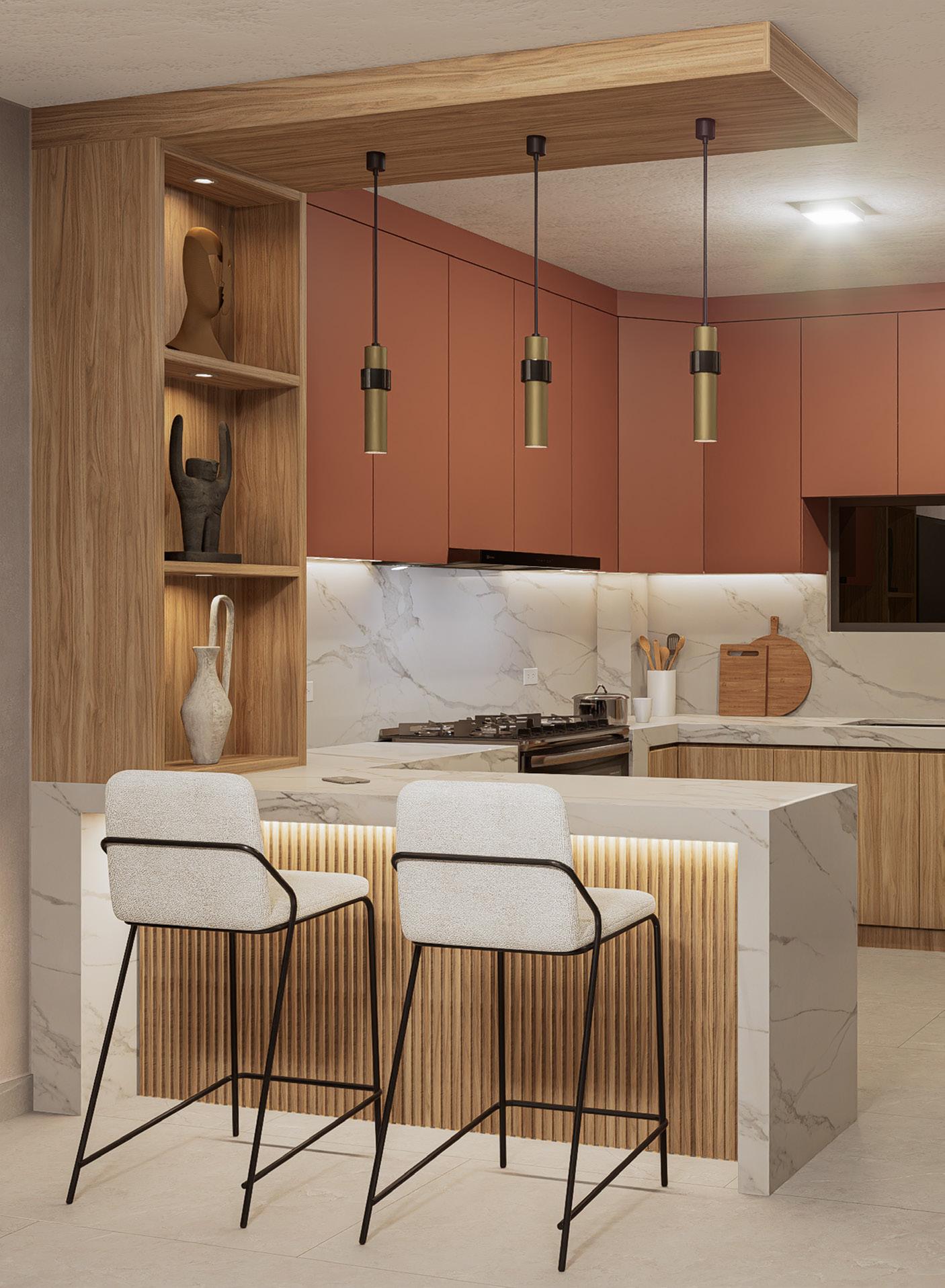 Se implementa el color arupo en la parte superior de los gabinetes, el cual tiene una textura mate y sin relieve; mientras que en la parte inferior se utiliza el color nacar, que cuenta con una textura maderada que genera armonía con el arupo mate. Con electrodomesticos en tonalidades negras que le proporciana caracter a la cocina, mientras que en el mesón se utiliza cuarzo blanco.