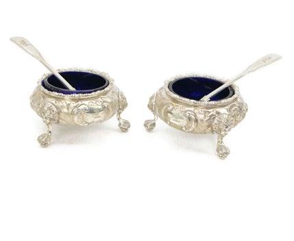 Pair of Victorian silver circular salts with blue glass liners, embossed floral decoration and claw and ball feet