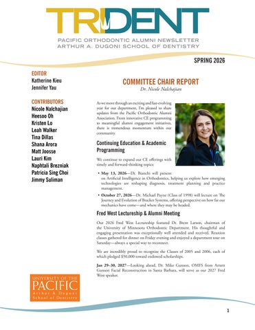 On behalf of the Pacific Orthodontic Alumni Association Committee, thank you for your continued engagement and support. Your involvement—whether through attendance, mentorship, philanthropy or simply staying connected— ensures that our department remains strong, innovative, and deeply rooted in community.