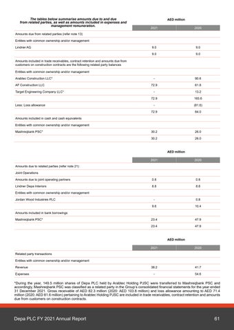 Financial liabilities AED million Liabilities at amortised cost Financial liabilities as at 31 December 2021 Trade and other payables** 486.7 Lease liabilities 30.8 Borrowings 591.574.0 Financial liabilities Financial liabilities as at 31 December 2020 Trade and other payables** 461.2 Lease liabilities 21.2 Borrowings 637.4155.0 The carrying amount reflected in previous page represents the Group’s maximum exposure to credit risk for such loans and receivables * excluding prepayments and advances to subcontractors and suppliers ** including retentions and excluding advance received and amounts due to construction contract customers 34. leases The consolidated statement of financial position shows the following amounts relating to leases: AED million 2021 2020 Right-of-use assets Retail outlets, office premises and warehouses 29.8 20.8 Lease liabilities Current 3.2 3.0 Non-current 27.6 18.2 30.8 21.2 amounts recognised in the consolidated statement of financial position Depa PLC FY 2021 Annual Report 77
