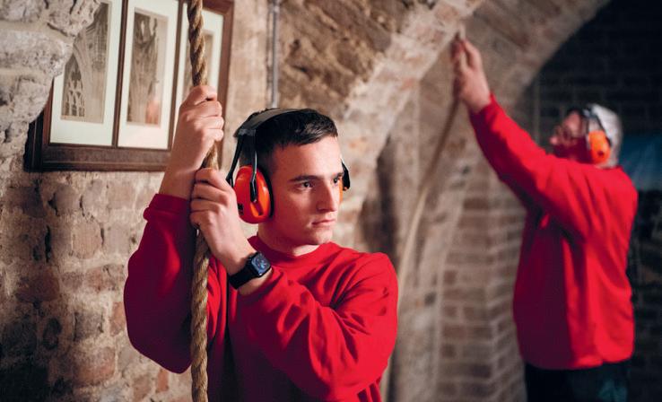 waren erbij. Ik was verbaasd dat mijn vrouw dat maandenlang verborgen heeft weten te houden. Daarnaast blijft het iedere keer weer bijzonder om een grote én een gewone luiding mee te maken. Bijvoorbeeld als alle klokken van de Domtoren tegelijk met de hand worden geluid tijdens het Festival Oude Muziek. Dat heet het volgelui. 4 mei vind ik ook een van de mooiste en belangrijkste momenten. Dan luiden we bijna een half uur lang de Salvator: de zwaarste klok in de Dom. Die weegt ongeveer 8500 kilo. Na ongeveer vijf minuten lossen we elkaar af. Dat is prachtig om te doen en om naar te luisteren.”