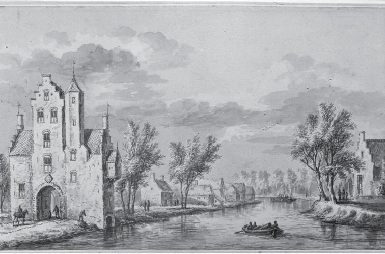 De Pellucussenpoort gezien vanuit het Noordwesten (richting Stad). De boog die aansluit op de Vecht is tegenwoordig de Pellucussenbrug (Fotoreproductie van een tekening van G. Rademaker uit 1778 naar een onbekende tekening uit 1622)