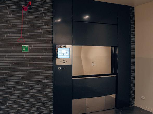 Tot slot laten Elisa en Melanie ons de crematieruimte zien. De ruimte ziet er steriel uit. Behalve de crematieoven is er een branddouche en staat er een uitvaartkist.
