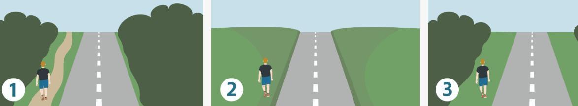 Is er geen ruiterpad, verhoogde of gelijkgrondse berm aanwezig? Of zijn deze delen van de weg niet toegankelijk en begaanbaar? Dan moet je verder te gaan in de volgorde van aanwezigheid.