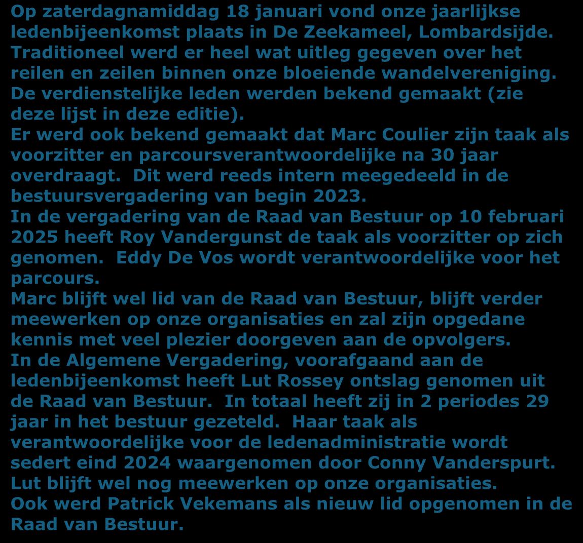 Op zaterdagnamiddag 18 januari vond onze jaarlijkse ledenbijeenkomst plaats in De Zeekameel, Lombardsijde. Traditioneel werd er heel wat uitleg gegeven over het reilen en zeilen binnen onze bloeiende wandelvereniging. De verdienstelijke leden werden bekend gemaakt (zie deze lijst in deze editie).
