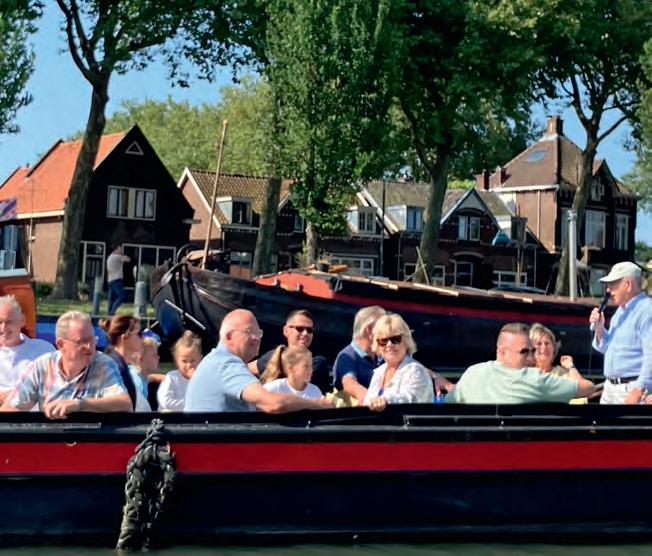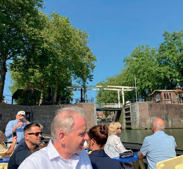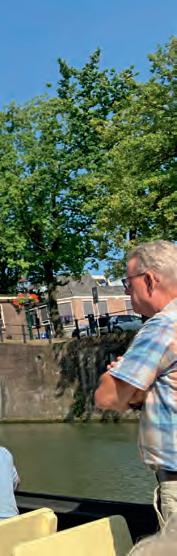 Na een drankje stapten we op de boot vanuit de Museumwerf en lieten ons varen door Vreeswijk. De Museumwerf draait op circa 90 vrijwilligers en fungeert naast de museumfunctie, ook als werf voor onderhoud en reparatie van schepen van meer dan 50 jaar oud. We werden verdeeld over twee boten, maar voeren ook samen zij aan zij een stukje. Onze groep zat in een replica van de Romeinse boot die bij De Meern is gevonden, zo werd ons verteld. Vreeswijk is nog steeds een schippersdorp waar we veel bootjes aan de kade zien liggen en waarbij oude schipperswoningen gecombineerd worden met nieuwbouw. Langs de terrassen aan het water, richting de oude sluis met oude deuren die niet meer in gebruik is.