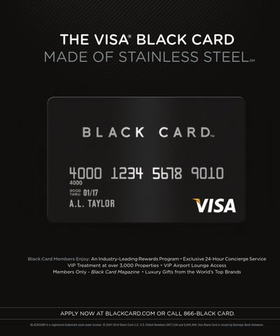 APPLY NOW AT BLACKCARD.COM OR CALL 866-BLACK CARD. BLACKCARD is a registered trademark used under license. © 2007-2014 Black Card LLC. U.S. Patent Numbers D677,330 and 8,640,948. Visa Black Card is issued by Barclays Bank Delaware.