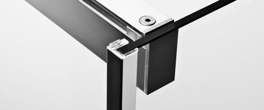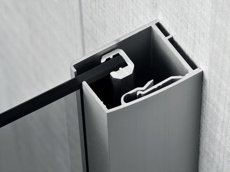 2 - Wall adjustment by means of an adjustable safety glass. The width adjustment is a design element. The wall adjustment of 25 mm at the side and fixed panels are guaranteed by the “inside the wall profile stepless adjustable tempered glass”.The glass is inserted and connected by means of adjusting screws to the wall profile. The adjusting screws allow easy adjustment of the fixed part within a range of 25 mm. The cover is clipped to the outer side. Regardless of the adjustment position, the outer view of the profile remains unchanged.