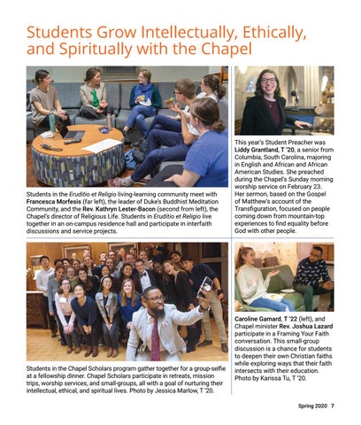 This year’s Student Preacher was Liddy Grantland, T ’20, a senior from Columbia, South Carolina, majoring in English and African and African American Studies. She preached during the Chapel’s Sunday morning worship service on February 23. Her sermon, based on the Gospel of Matthew’s account of the Transfiguration, focused on people coming down from mountain-top experiences to find equality before God with other people.