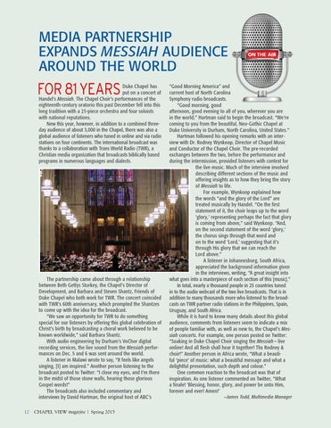 Duke Chapel has put on a concert of Handel’s Messiah. The Chapel Choir’s performances of the eighteenth-century oratorio this past December fell into this long tradition with a 25-piece orchestra and four soloists with national reputations. New this year, however, in addition to a combined threeday audience of about 3,000 in the Chapel, there was also a global audience of listeners who tuned in online and via radio stations on four continents. The international broadcast was thanks to a collaboration with Trans World Radio (TWR), a Christian media organization that broadcasts biblically based programs in numerous languages and dialects.