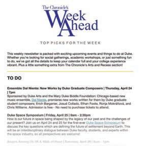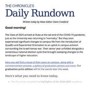 On behalf of The Chronicle, we're glad you're here. We hope this guide will help you get acclimated into your new community. Keep up with all Duke University and Durham news at DukeChronicle.com.