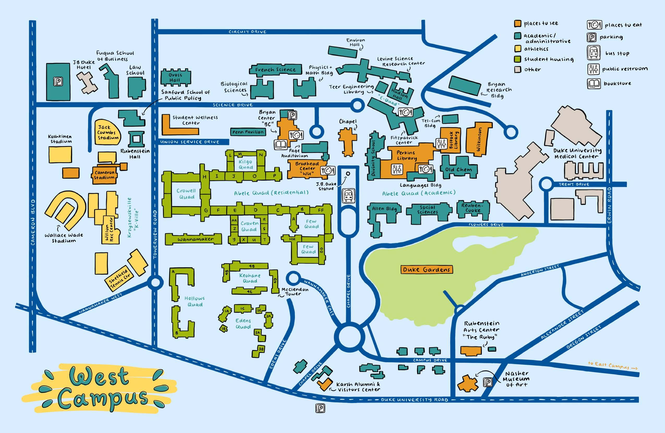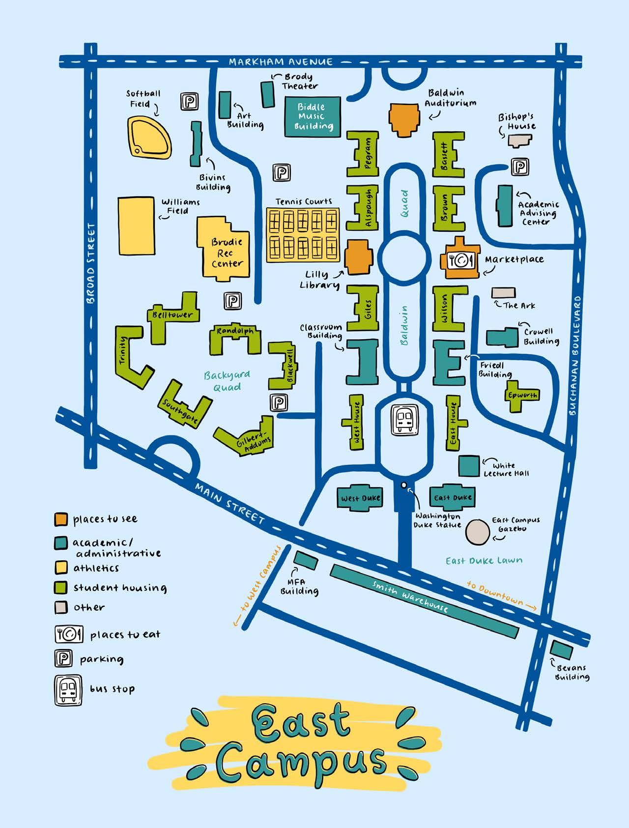 All first-year students are required to live in one of 12 residence halls on East Campus. East Campus was originally the site of Trinity College and the Women’s College from 1930-1972, but it became first-year exclusive in 1995. The main features on East Campus include Lilly Library, The Ark dance studio, and Marketplace—the first-year dining hall.