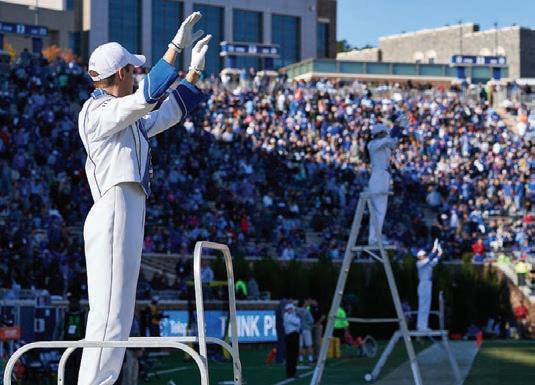 The band has an extensive leadership team consisting of a band director, assistant band director, student leadership team and section leaders. Jeff Au, band director for Duke Athletics, works with Assistant Band Director Leigh-Ann Lethco to arrange music, organize logistics for football game days and manage the band’s budget and student recruitment efforts.