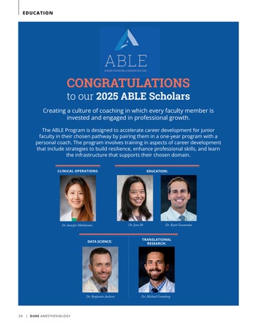 to our 2025 ABLE Scholars Creating a culture of coaching in which every faculty member is invested and engaged in professional growth. The ABLE Program is designed to accelerate career development for junior faculty in their chosen pathway by pairing them in a one-year program with a personal coach. The program involves training in aspects of career development that include strategies to build resilience, enhance professional skills, and learn the infrastructure that supports their chosen domain. CLINICAL OPERATIONS: