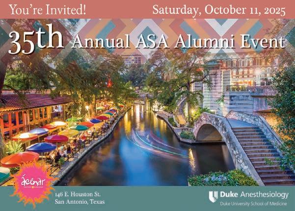 DUKE ANESTHESIOLOGY marked its 34th and 35th Annual American Society of Anesthesiologists (ASA) Alumni Events by hosting receptions on October 19, 2024 at Stratus Rooftop Lounge, just steps away from Philadelphia’s iconic Liberty Bell, and on October 11, 2025 at Acenar, along San Antonio’s iconic River Walk, for a night of celebration.