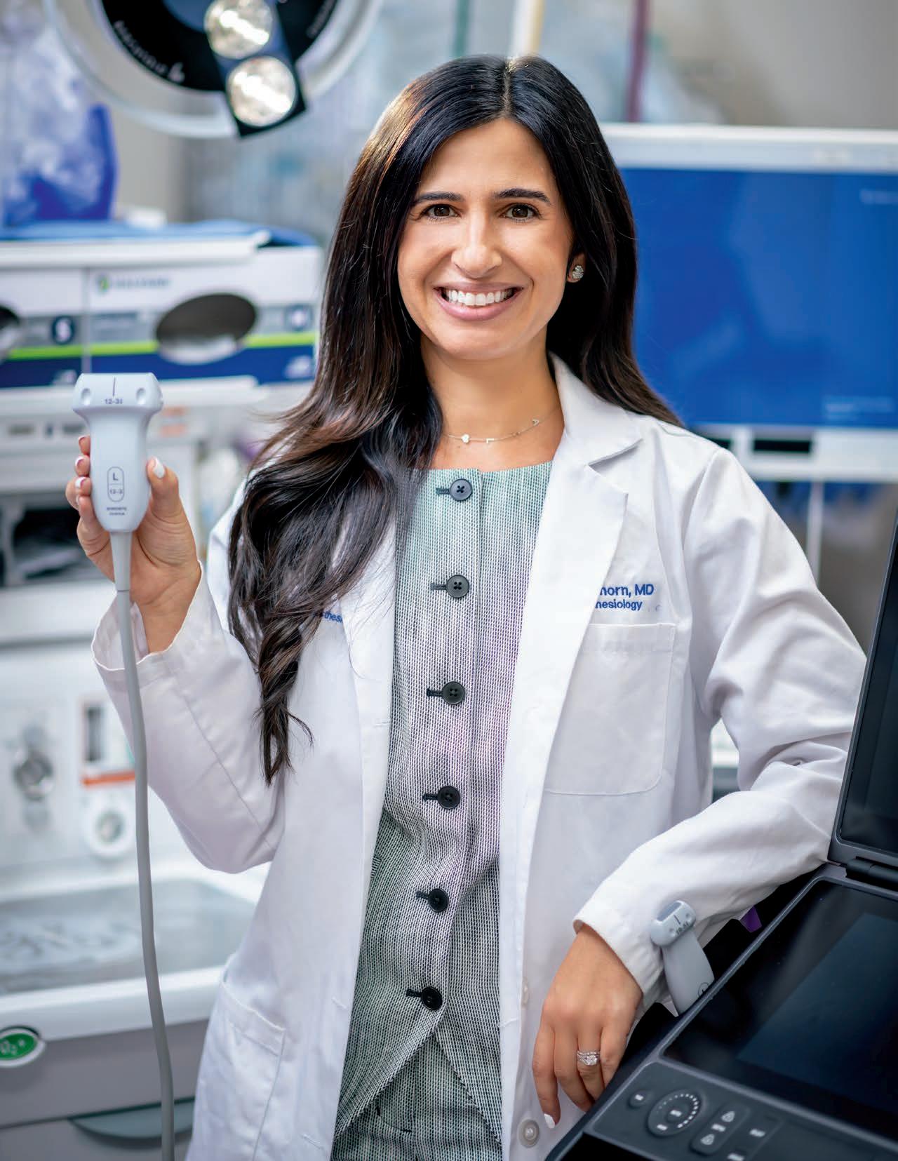 academic aspects of anesthesiology—its interplay of pharmacology and physiology and watching medications work in real time—fascinate her. She’s excited about how the field is transforming patient care with cutting-edge technology. “A lot of what we do in the operating room is minimally invasive, which 10 years ago would not have been fathomable,” she explains enthusiastically.