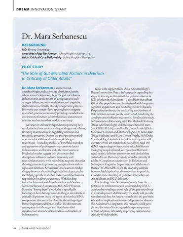 “The Role of Gut Microbial Factors in Delirium in Critically Ill Older Adults” Dr. Mara Serbanescu is an intensivist, anesthesiologist and early-stage physician-scientist whose research focuses on how the gut microbiome influences the development of complications such as organ failure, secondary infections, and cognitive dysfunction in critically ill and postoperative patients. Her work uses systems-level approaches to integrate microbial genome community profiling, metabolomics and immune function data with clinical outcomes to uncover mechanisms that modulate recovery. Advances in culture-independent sequencing have revolutionized our understanding of the gut microbiota, revealing its critical role in regulating immune and metabolic processes. During the perioperative period or acute critical illness, disturbances in the gut microbiota—including the loss of beneficial microbes and expansion of pathogens—are common due to inflammation, antibiotics and other interventions. Preclinical studies suggest that these microbial disruptions influence systemic immunity and neuroinflammation, with microbiota-targeted therapies showing promise in preventing complications such as sepsis and delirium. Serbanescu’s work aims to bridge the gap between these findings and clinical practice by identifying specific microbial features and mechanisms responsible for adverse outcomes. With funding from the International Anesthesia Research Society Mentored Research Award and the Duke PhysicianScientist “Strong Start” award, she is specifically focusing on how derangements in the gut microbiota in critically ill patients shape the types of microbial DNA components that enter the blood in the setting of gut barrier hyperpermeability, as well as the downstream consequences of these gut and blood microbial signatures on immune cell activation and markers of inflammation.
