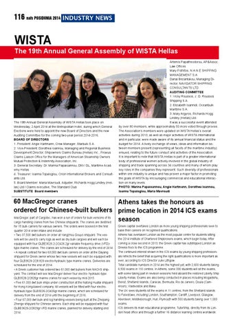 Artemis Papatheodorou, AP&Assoc. Law Offices Mary Pothitos, N.A.N.E SHIPPING MANAGEMENT S.A Danai Bezantakou, Managing Director, NAVIGATOR SHIPPING CONSULTANTS LTD. AUDITING COMMITTEE 1. Vicky Roussos, J. G. Roussos Shipping S.A. 2. Elizabeth Ioannidi, Oceanbulk Maritime S.A. 3. Mary Argyros, Richards Hogg Lindley (Hellas) Ltd. It was a successful event attended by over 80 members, while approximately 50 more voted through proxies. The Association’s members were updated on WISTA Hellas’s overall activities during 2013, as well as major activities of WISTA International and in particular, were made aware of its annual financial status and the budget for 2014. A lively exchange of views, ideas and information between members present (representing all facets of the maritime industry) ensued, relating to the future conduct and activities of the Association. It is important to note that WISTA Hellas is part of a greater international body of professional women actively involved in the global industry of shipping and trade spanning across 34 countries and many of whom play key roles in the companies they represent. Such diversity of professionals within one industry is unique and has proven a major factor in promoting the goals of WISTA by encouraging commercial and educational interaction on many levels. PHOTO: Marina Papaioannou, Angie Hartmann, Dorothea Ioannou, Ioanna Topaloglou, Maria Mavroudi
