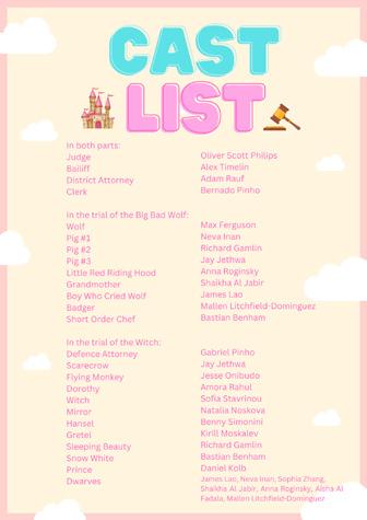Miss Ferguson is pleased to announce the cast list for the whole school production of Fairy Tale Courtroom by Dana Proulx-Willis.