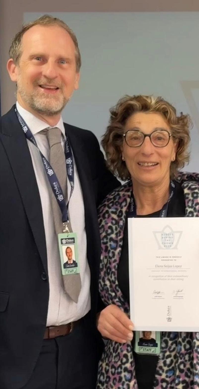 “At Engage International School, we were incredibly proud to present this award to someone who deserved it more than anyone: our dear colleague, Elena Seijas. With over 30 years’ of dedication, Elena has worked with several generations of pupils, and this award is a recognition of her remarkable adaptability, her consistently positive attitude, and the immense kindness with which she treats students, teachers and colleagues alike. Always ready to help, always with a smile, Elena is the very definition of discretion and one of the people who knows the school best. She has become an institution in our beloved school. Thank you, Elena, our Hero behind the Crown, for your joy, your dedication and your unwavering commitment.”