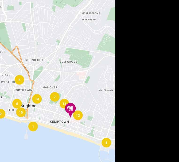 Bloomsbury St 1 2 3 4 5 6 7 8 9 10 11 12 13 14 15 Brighton Marina Royal Sussex County Hospital Brighton College Royal Pavillion Amex HQ Hove Train Station Hove Lawns i360 Brighton Lanes Queens Park Brighton Train Station Hove High Street Hove Park Hove Lagoon Brighton Pier