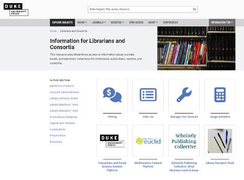 • Shared library administration tools across Duke University Press and Scholarly Publishing Collective platforms