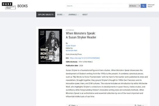 Duke University Press supports scholars in doing what they are passionate about: learning, teaching, and effecting positive change in the world. This bold, progressive spirit drives both what and how we publish. Each year we publish over 150 new books, around 60 journals, and multiple digital collections that transform current thinking and move fields forward.