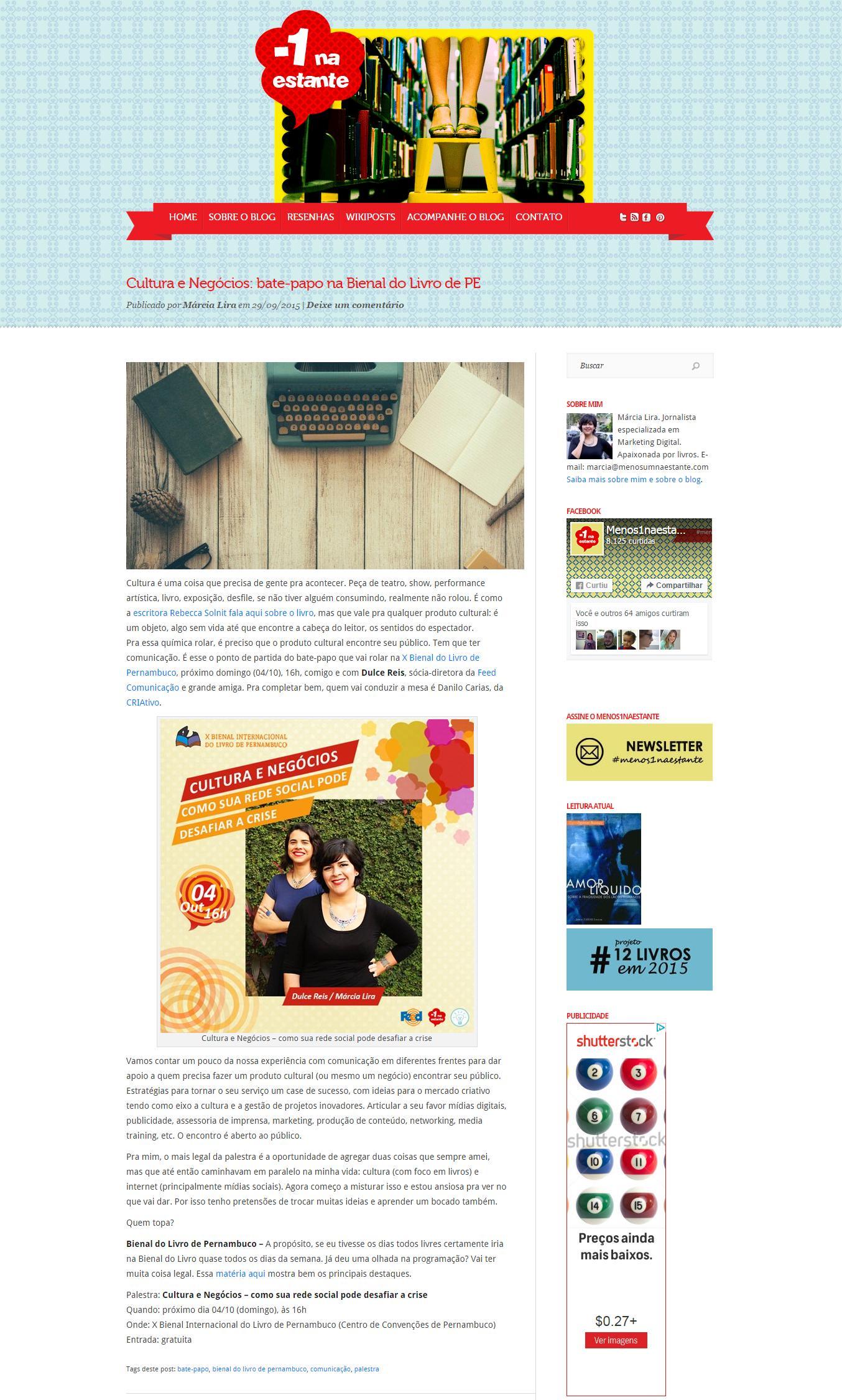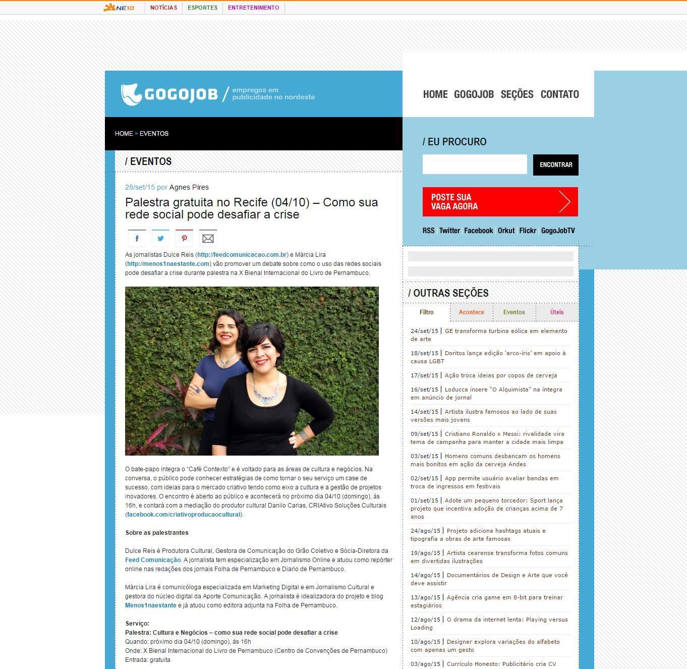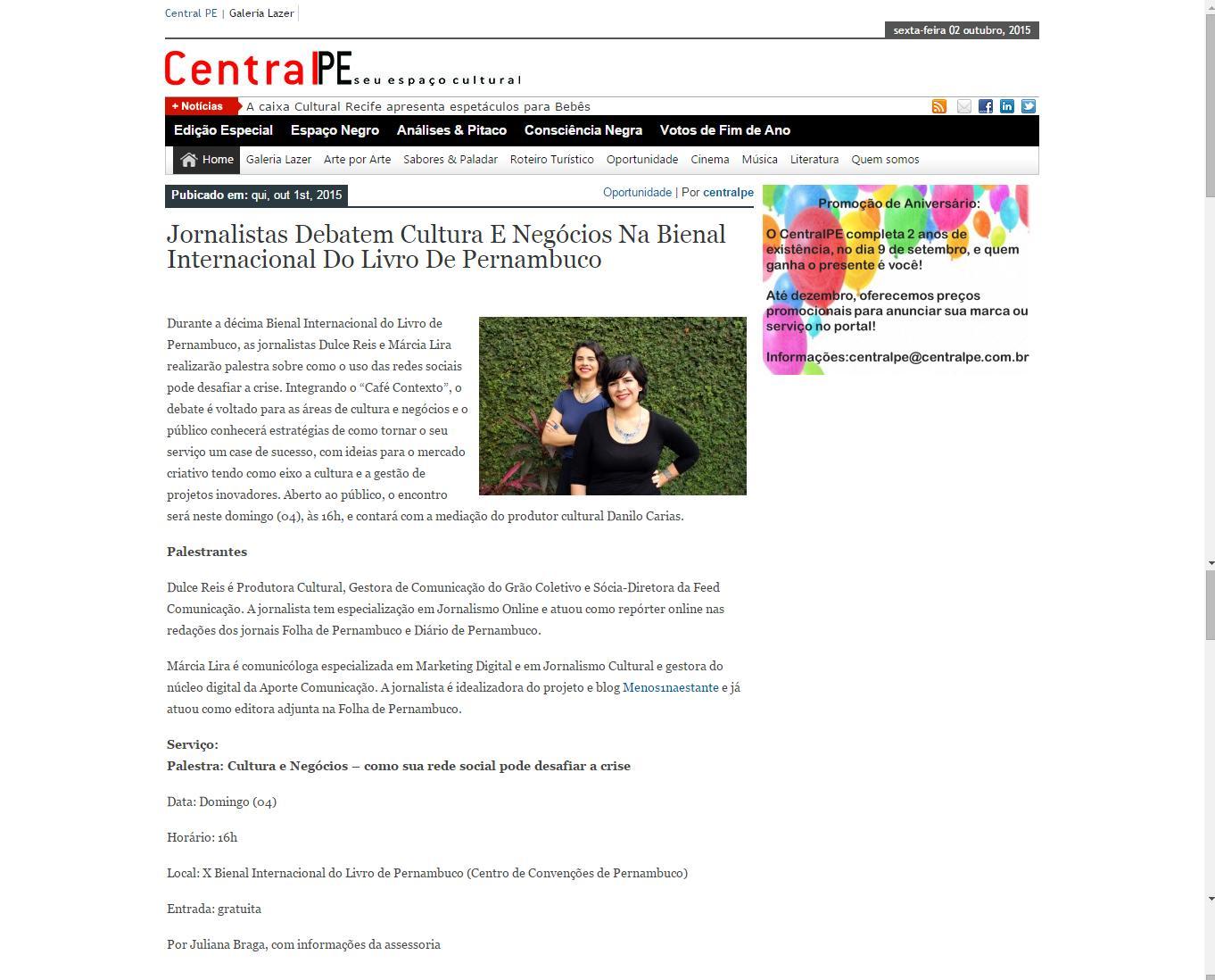 Clipping da palestra "Cultura e Negócios - Como as redes sociais podem desafiar a crise" realizada na X Bienal Internacional do Livro de Pernambuco (2015), no dia 04/10. O bate-papo foi comandado pelas jornalistas Dulce Reis (http://feedcomunicacao.com.br) e Márcia Lira (http://menos1naestante.com), com mediação do produtor cultural Danilo Carias, Criativo Soluções Culturais (https://www.instagram.com/criativosolucoes).