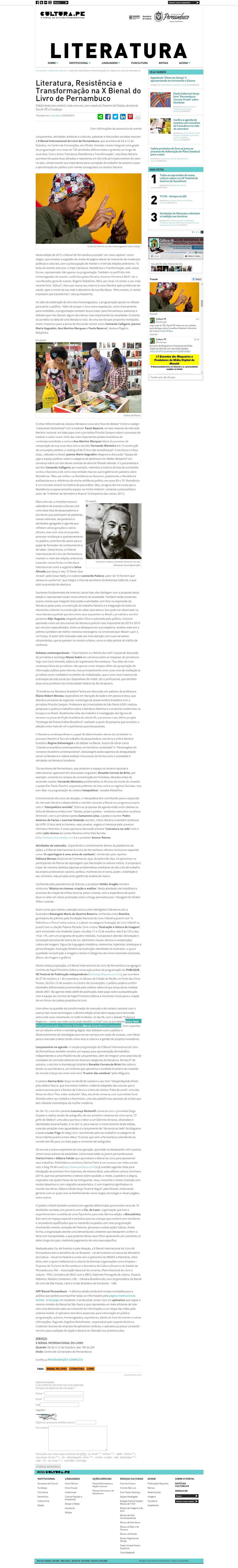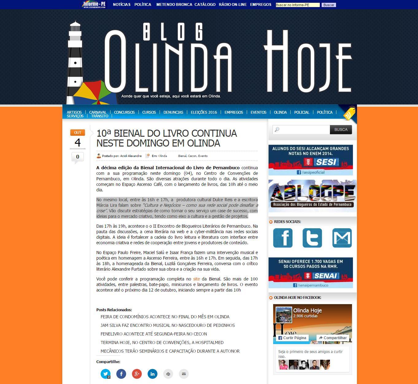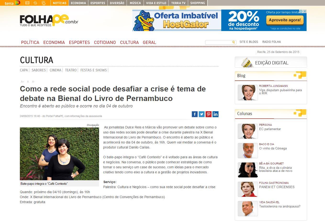 Clipping da palestra "Cultura e Negócios - Como as redes sociais podem desafiar a crise" realizada na X Bienal Internacional do Livro de Pernambuco (2015), no dia 04/10. O bate-papo foi comandado pelas jornalistas Dulce Reis (http://feedcomunicacao.com.br) e Márcia Lira (http://menos1naestante.com), com mediação do produtor cultural Danilo Carias, Criativo Soluções Culturais (https://www.instagram.com/criativosolucoes).