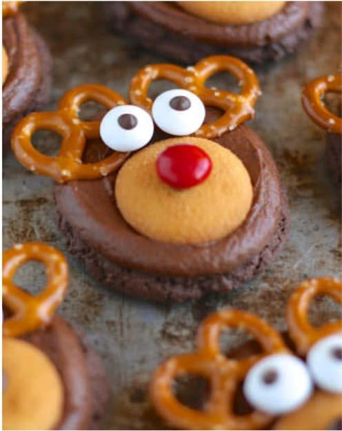 2. Use some of the chocolate frosting to stick the candy eyes and red candy nose onto the pretzels and vanilla cookie respectively.
