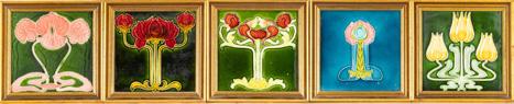 Art Nouveau Glazed Floral Tiles Group Of Five
