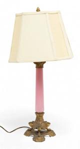 Paul Hanson Lighting Co. Pink Opaline Glass And Patinated Metal Column-form Table Lamp, Ca. 1940s, H 27.5” Dia. 7”